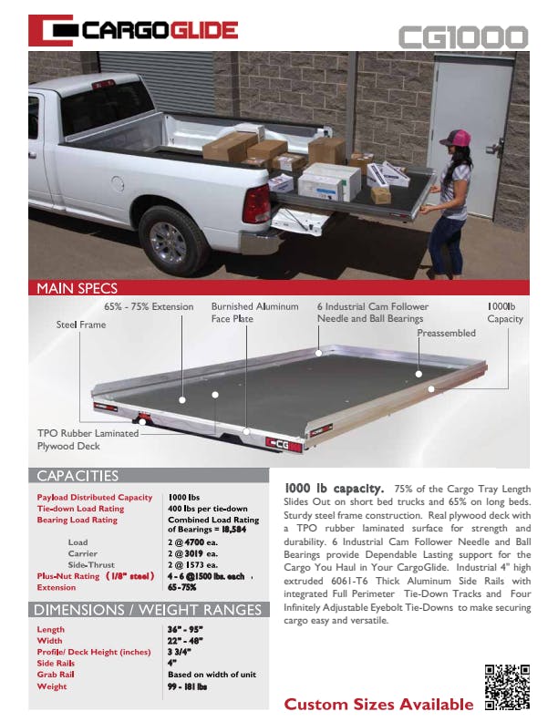 1000 lb capacity. 70% of the Cargo Tray Length Slides Out. Sturdy steel frame construction. Real plywood deck with a TPO rubber laminated surface for strength and durability. 6 Industrial Cam Follower Needle and Ball Bearings provide Dependable Lasting support for the Cargo You Haul in Your CargoGlide. Industrial 4 in. high extruded 6061-T6 Thick Aluminum Side Rails with integrated Full Perimeter Tie-Down Tracks and 4 Infinitely Adjustable Eyebolt Tie-Downs to make securing cargo easy and versatile.