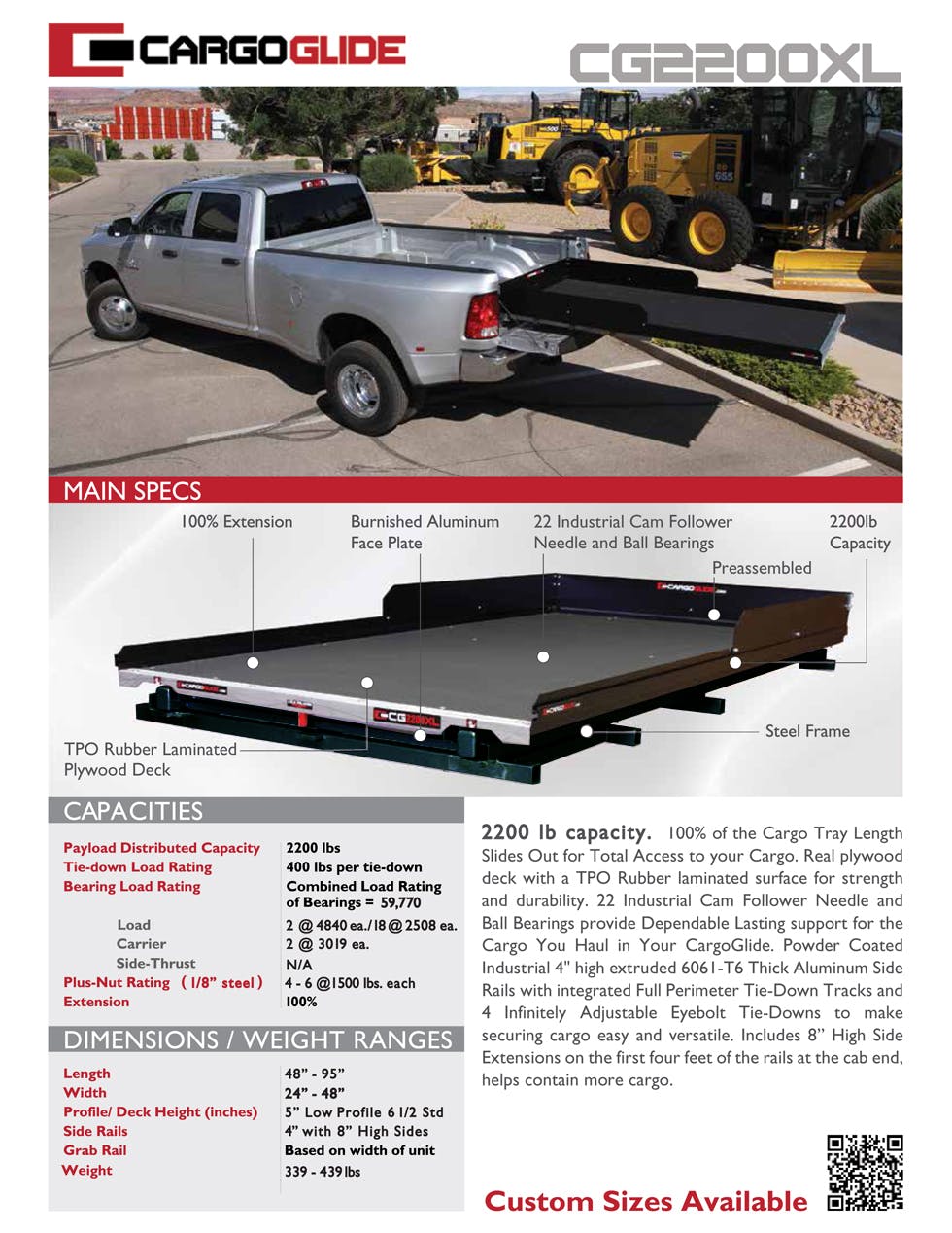 2200 lb capacity. 100% of the Cargo Tray Length Slides Out for Total Access to your Cargo. Real plywood deck with a TPO rubber laminated surface for strength and durability. 22 Industrial Cam Follower Needle and Ball Bearings provide Dependable Lasting support for the Cargo You Haul in Your CargoGlide. Powder Coated Industrial 4 in. high extruded 6061-T6 Thick Aluminum Side Rails with integrated Full Perimeter Tie-Down Tracks and 4 Infinitely Adjustable Eyebolt Tie-Downs to make securing cargo easy and versatile. Includes 8 in. High Side Extensions on the first four feet of the rails at the cab end that helps contain more cargo.
