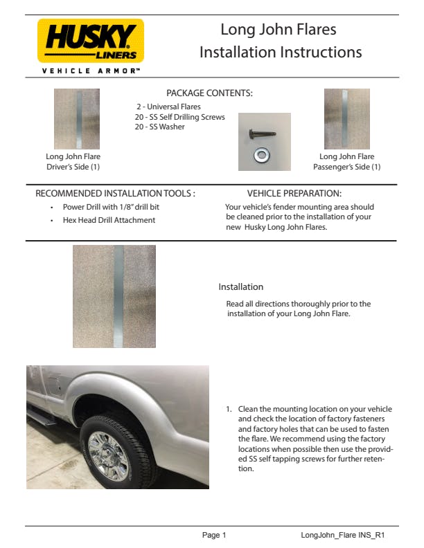 You re a man who wants it all. A cool truck; some big tires and a pony. Lucky for you; Husky Liners universal fit Long John Fender Flares have you covered. Made from a durable; impact resistant all-weather thermoplastic