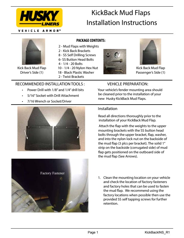 | Features and Benefits | Made from heavy-duty powder coated stainless steel, the offset mounting bracket positions your mud flap back, adding extra clearance to protect the world from your huge tires., 12 or 14 inch options for better protection from the road's rage., Our AntiSpray™ material is formed with Micro-Grooves™ that funnel the muck back down to the road., Our 14 gauge anchor weights give you the perfect balance of weight and durability., Choose between a mirrored finish anchor weight or a matte black finish. We've got both extremes to the extreme!, No hassle lifetime guarantee. For details: HuskyLiners.com/ForLife, Made in the USA. |