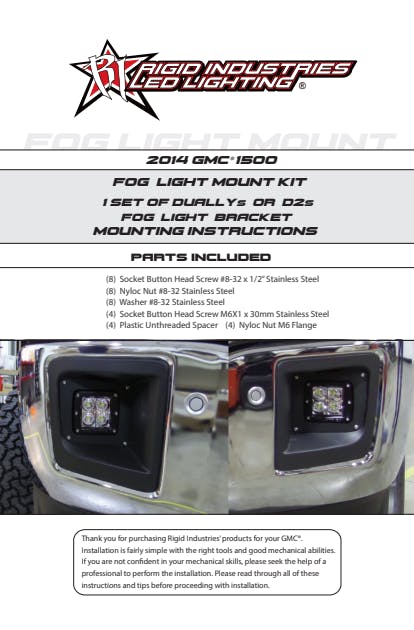 RIGID Industries has found a way to fit a square peg in a round hole. Our 2014-2015 GMC 1500 fog light replacement kit allows you to mount the RIGID Industries D-Series (D-Series) LED lights in your GMC 1500's OE fog lamp locations. This kit gives your otherwise square D-Series lights a clean from-the-factory look without having to drill or cut into your bumper. Made from high quality stainless steel, these adaptor plates are powder-coated black for a durable, long-lasting finish. This kit comes with everything you need to install D-Series lights (not included) in both front bumper fog light locations and is backed by a RIGID Industries limited lifetime warranty.